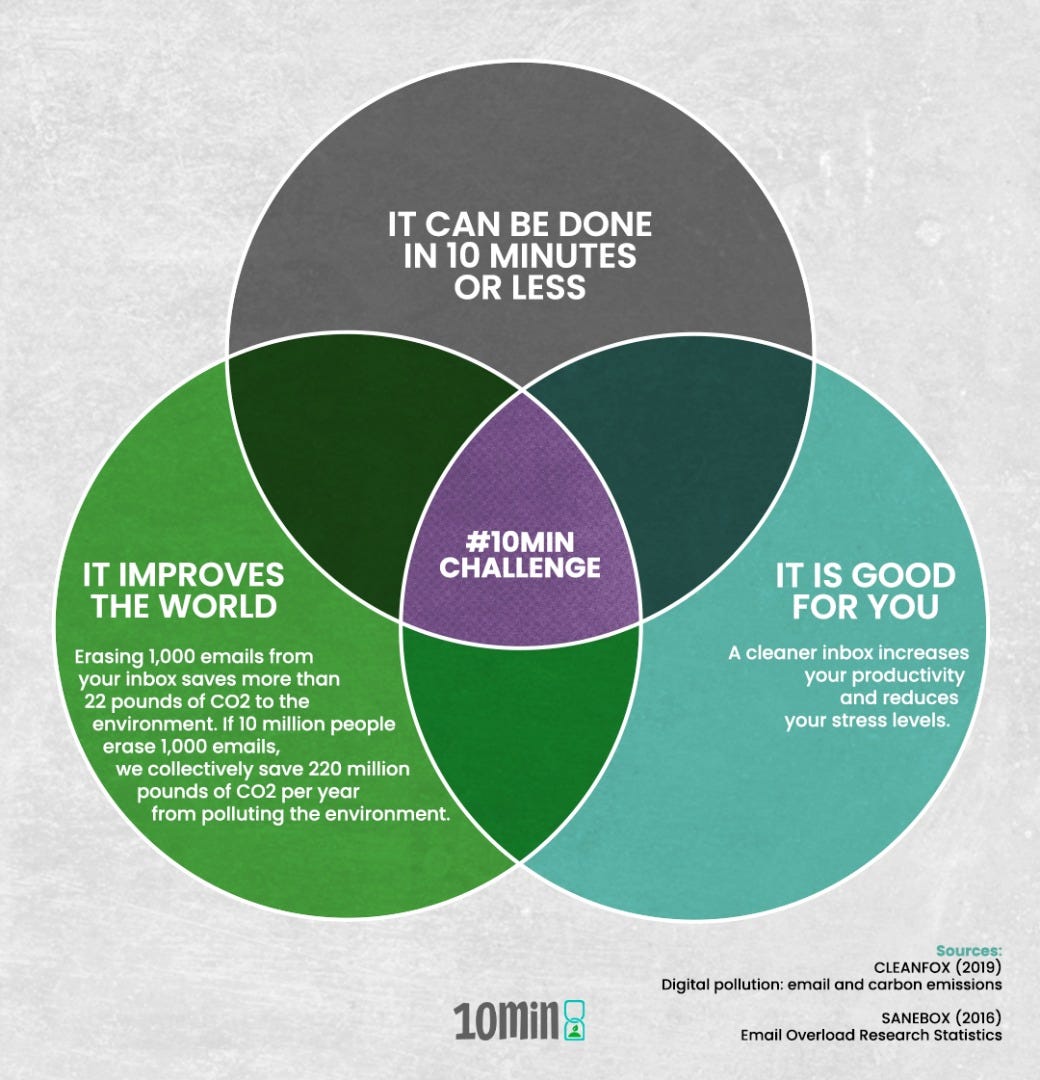 This #10minchallenge is a learning experience: itās an opportunity to understand and communicate what the digital carbon footprint and digital pollution are. The best thing about it is that it might be the start of a behavioral change; perhaps cleaning your inbox more often or subscribing only to newsletters or email marketing lists that bring value to you.Ā